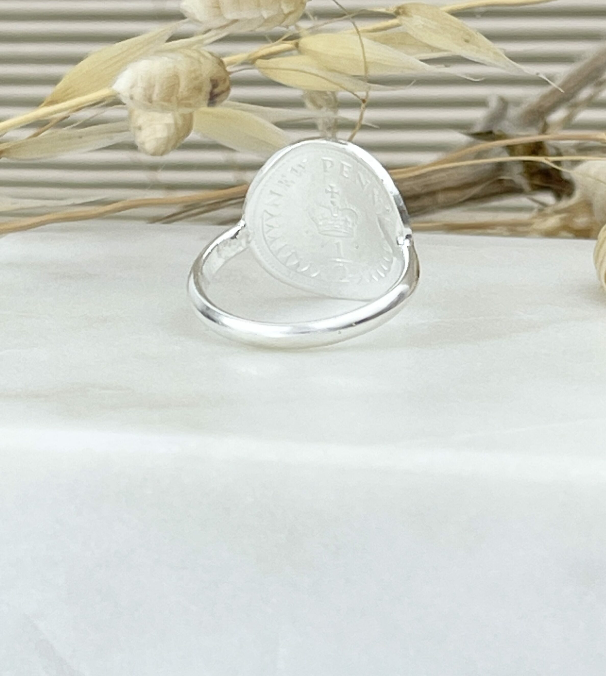 Véritable pièce Anglaise d’1/2 Penny où figure le profile de la reine Elizabeth II. Plaquée or à 3 microns à 24 carats ou argent 925 à 10 microns. Choisissez le côté de la pièce.